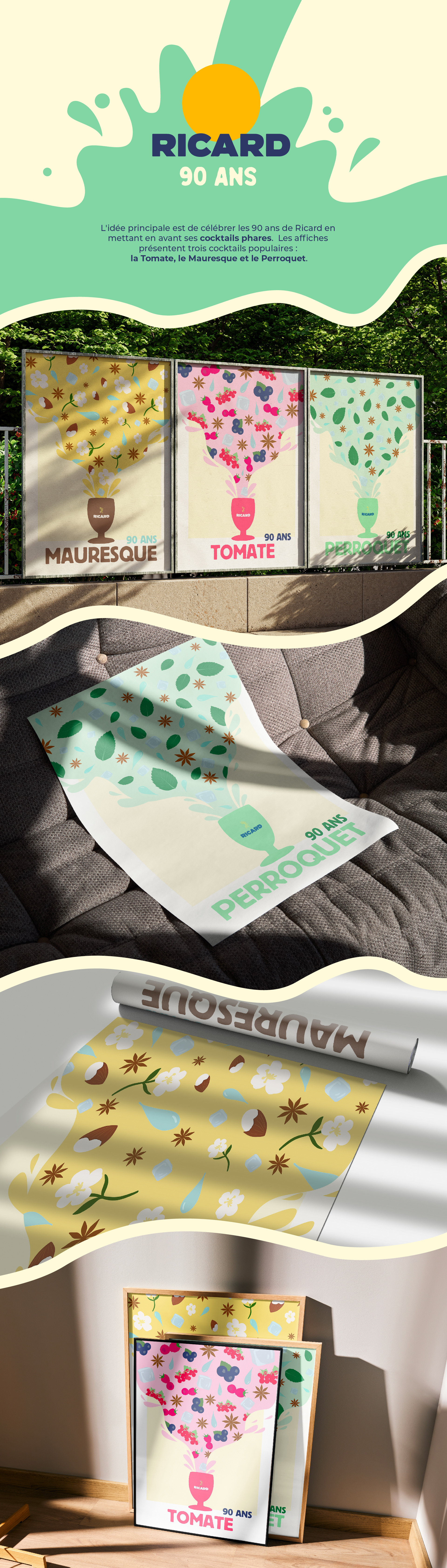Affiches cocktails à l'occasion des 90 ans de Ricard, la marque leader du pastis de Marseille.